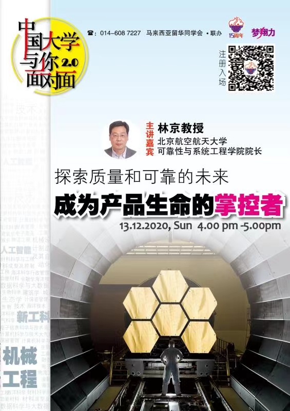 12月13日,国际学院参加马来西亚留华同学会主办的“中国高等教育线上教育展”并做线上专题宣讲。本场宣讲首先邀请质量与可靠性工程学院的林京院长,为同学们做主题为《探索质量与可靠的未来,成为产品生命的“掌控者”》专业讲座,林院长从Why、What、How、Where的角度,为同学们全面解读质量与可靠性专业。在互动提问环节,同学们围绕质量与可靠性专业的研究方向、就业情况、北航的学习氛围、奖学金申请、录取情况等话题踊跃提问,林院长和国际学院的老师为同学们做了详细解答。