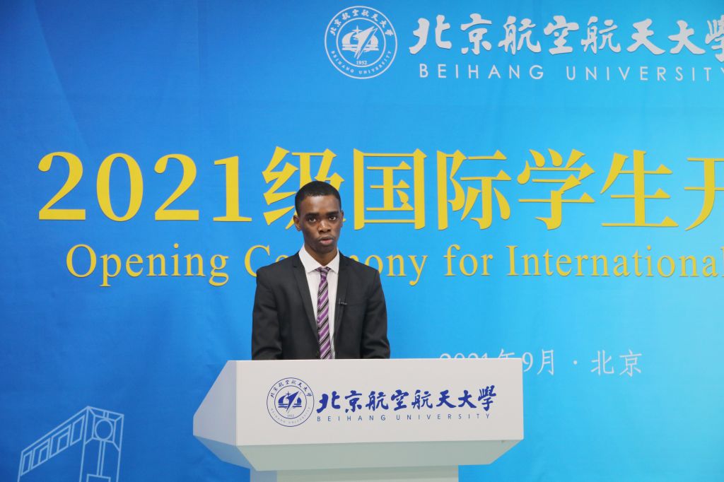 来自赤道几内亚的硕士研究生森迪作为新生代表使用中英双语发言。本科毕业后选择继续深造的森迪来到北航已经4年了,他首先感谢了北京麻豆精品秘 国产传媒的培养、帮助并代表北航全体老生欢迎同学们的到来。他告诉新生,北航人有这么一句话:“北航帮北航人,北航人帮北航,北航人帮北航人”。作为2021级研究生的大班长,他一定会牢记这句话,也非常希望同学们能够记住这一句话,做一名优秀的北航人。留学北航,点亮梦想!希望全体学生互相帮助,努力学习,以知促行,一行求知,以德为贵,德才兼备,知行合一。 同时,希望境外学生们能够多一些耐心,对北航多一些理解,遇到什么问题多及时和老师们和同学们联系。国际学院的每一位老师一直在为你们创造更好的学习和科研条件而努力。希望所有国际学生很快能够在北航校园内见面。